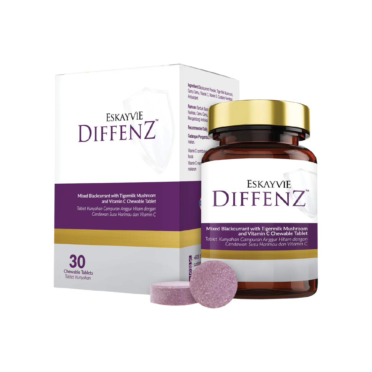 Eskayvie Diffenz™ – fusion of 4 ingredients – Tiger Milk Mushroom, Camu-camu, Vitamin C and Vitamin D in one blackcurrant chewable tablet.